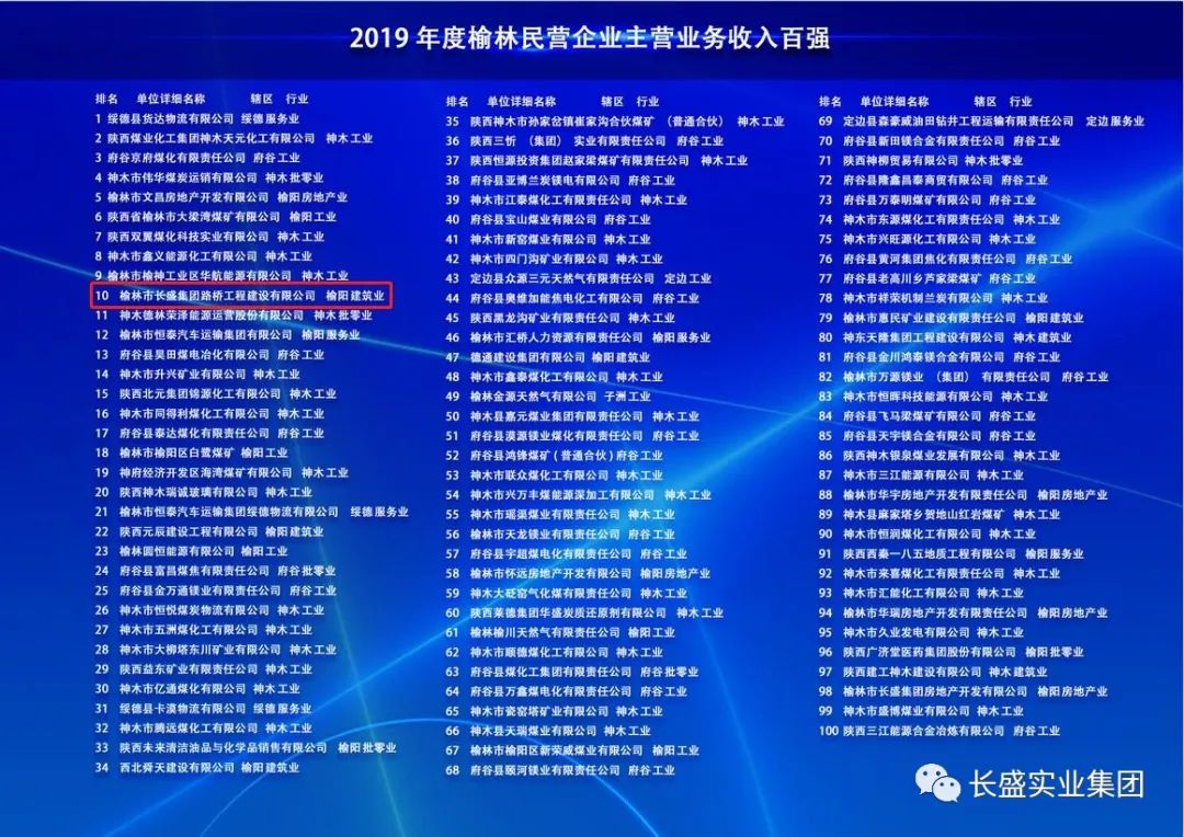 長盛路橋公司入榜榆林市建筑企業(yè)主營業(yè)務(wù)收入四十強和民營企業(yè)主營業(yè)務(wù)收入百強