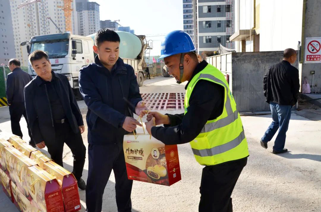 公司總經(jīng)理徐遼飛、副總經(jīng)理劉世斌、總工程師曹光軍、總經(jīng)理助理楊斌等一行赴榆林區(qū)內(nèi)盛景和苑項目、盛景蘭亭項目和流水馨城項目現(xiàn)場,慰問堅守在項目一線的員工,并為他們送上羊肉、月餅、水果等慰問品。每到一個項目,公司領(lǐng)導(dǎo)都送上一聲聲“節(jié)日快樂”的祝福,道上一句句“大家辛苦了”的關(guān)懷與感激。