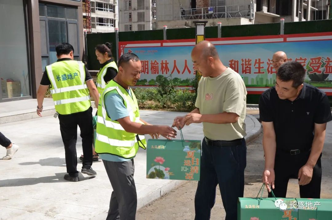 7月13日,榆林市長(zhǎng)盛集團(tuán)房地產(chǎn)開發(fā)有限公司開展2022年度“情系職工送清涼”慰問活動(dòng),看望慰問榆林區(qū)內(nèi)在建項(xiàng)目一線員工,為他們送去小米、綠豆、白糖、西瓜等防暑降溫物品。
