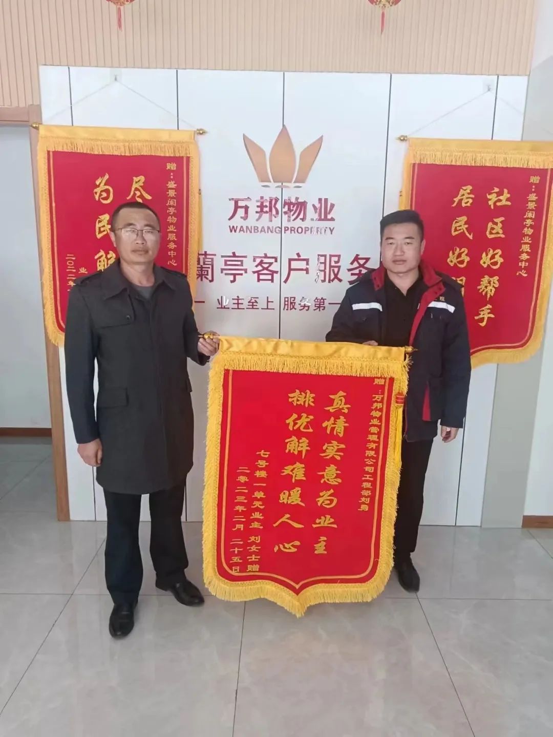 近日,萬邦物業(yè)盛景蘭亭項目又迎來了一面鮮紅的錦旗,繡著“排憂解難暖人心,真情實意為業(yè)主”的字樣,送給了工程師傅劉勇,字里行間流露著業(yè)主的感激之情。